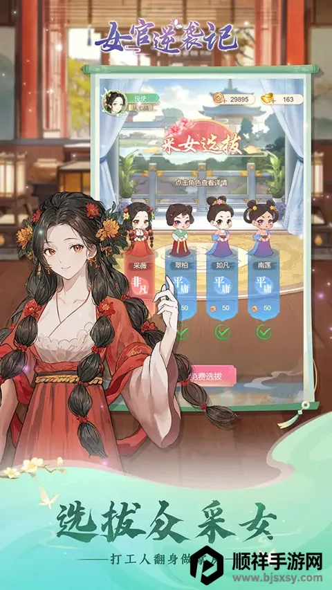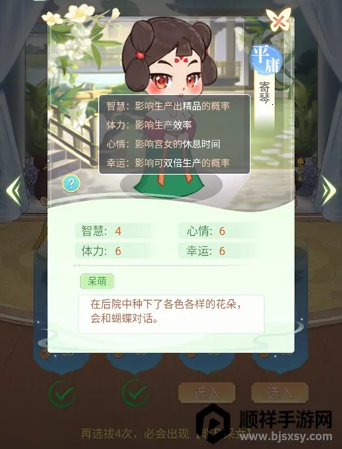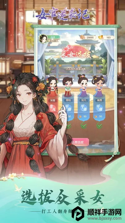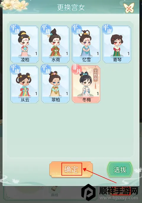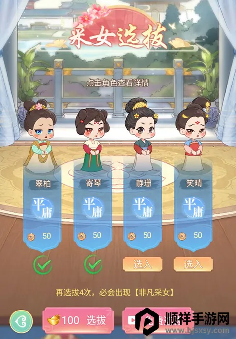 1、玩家点击右下角的选拔即可进行采女的选拔,选择合适的采女加入宫中进行工作。