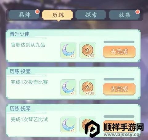 历练成就目前只有官职、投壶、抚琴三个成就任务,完成就可领取成就奖励。