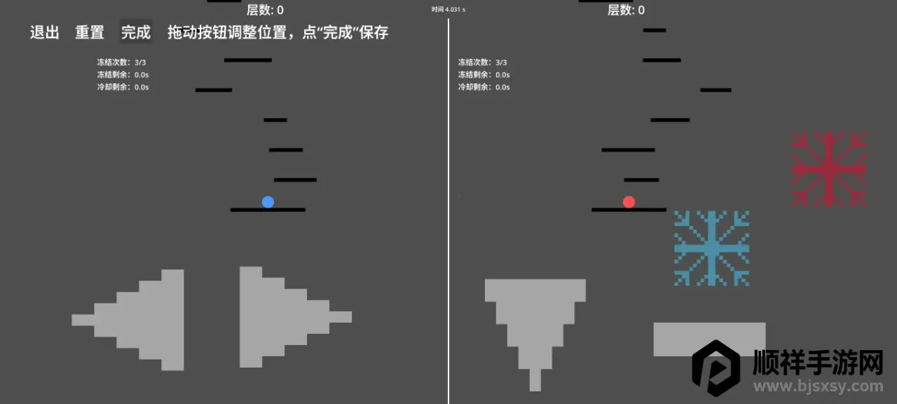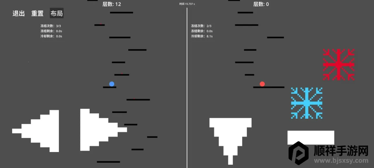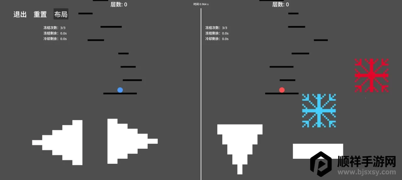 这是一款操控双球跳跃的挑战游戏。胜利条件是两边球同时碰到第100层白门,否则失败。手机端和电脑端操作不同,手机端按键针对正常世界,电脑端用WASD等控制。不同颜色雪花键对应冻结技能,可冻住对应球3s。游戏略难,会记录最快登顶时间,能挑战自我极限。每次重置平台随机刷新,还可自由调整按键位置适配手机分辨率,无背景音乐。想体验独特的双球跳跃挑战,不妨试试这款游戏。