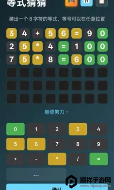 一款超烧脑的游戏来袭。每一关都有专属神秘等式,你只有6次猜想机会。输入推测等式后,游戏会给出反馈提示,助你判断数字、运算符号及排列顺序是否正确。你要依据反馈推理排除错误答案,在次数用尽前找出唯一正确等式。这**极致考验数字敏感度与逻辑推理能力**,想挑战自己吗?快来试试,看能否在重重迷雾中找到正确等式,感受烧脑与破解谜题的双重乐趣,体验独特的数字推理之旅。
