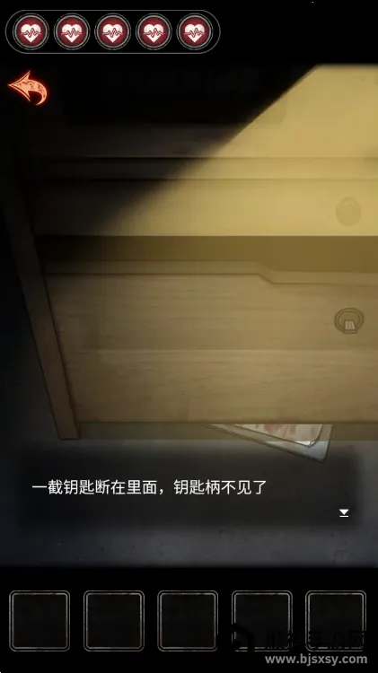 4、打开抽屉看看里面有什么,一截钥匙断在 里面,钥匙柄不见了,需要找个工具打开这个抽屉,寻找可以打开抽屉的道具吧;