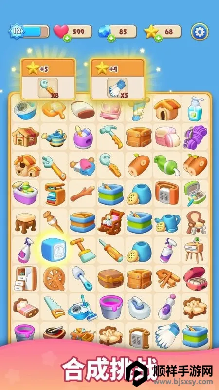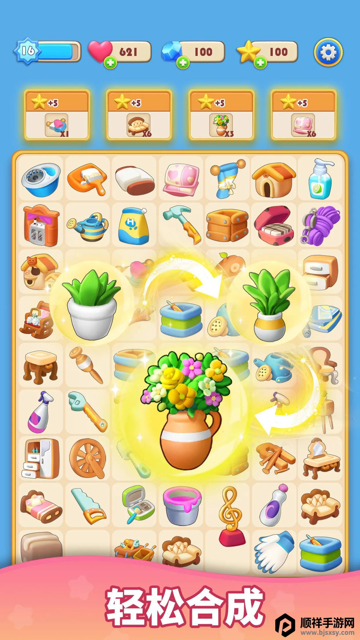 1. 轻松上手:合并拼图游戏板上两个相同元素,创造新物品和工具,翻新各类房间。