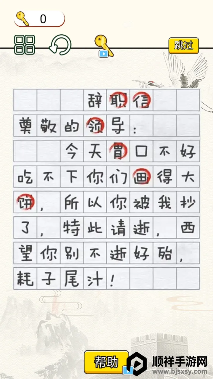 《疯狂脑洞达人3》是一款超有趣的文字解谜游戏。它延续了前作风格,能极大满足你对文字找茬的需求。游戏里有海量原创文本,涵盖多元文化领域,从日常用语到专业术语的错位组合都有。玩法简单,进入游戏后,仔细浏览文章,通过点击标记发现的错别字或错误词汇,正确找出会获动态标记与分数奖励,目标是找出所有错误。其特色在于包含错别字、成语误用、语法混乱及标点错位等多维度错误类型系统,部分错误还需结合前后文推理判断,培养整体阅读与逻辑推断能力。而且特定关卡有历史典故与文学引用彩蛋,成功修正可解锁相关文化背景说明。动态难度设计从单字错误逐步过渡到语义双关,即时反馈机制为每个错误提供详细解析,在游戏过程中提升语文素养。闲暇时刻来挑战,乐趣无穷,赶紧下载体验吧!