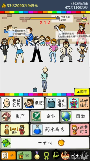 轻松有趣的体验:采用放置玩法,狂点屏幕就能赚钱,基础操作简单易上手。雇佣多元社会群体助力,收益加速超高效。还有超丰富的投资项目,置办家产、收购企业甚至买国家都可行。剧情收集乐趣足,购物卡、剧情卡多样,沙雕内容惊喜不断。