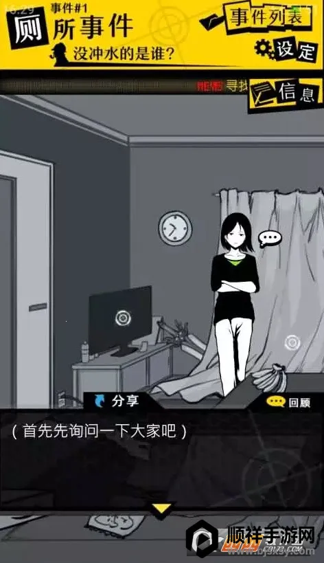 这是一款超有趣的日系推理解谜游戏。在与大学研究小组聚会当晚,发生了可怕事件——有人没冲厕所!你要通过各种线索找出真凶。需点击屏幕寻找证据,听取在场人员证言,但因主人公记忆力差,只能记2条。在生活化场景中仔细探查,利用有限记忆验证线索并做决定影响结局走向。比如第一章要分别与角色调查,点击发光物体,用风扇散厕所味,进入后找各种物品,询问大家保存2条证词,通过镜子发现线索,最后取证反驳证词。其玩法独特,画风精美,章节有趣,结局不定,快来体验当侦探的快感!