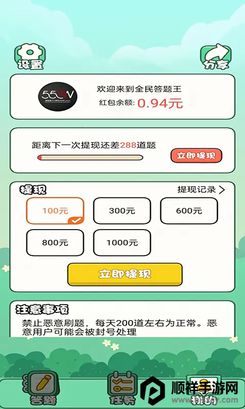 全民答题王是一款备受欢迎的答题闯关手游。它适合各年龄段玩家,能让大家在趣味中积累知识、拓宽视野。**高额红包奖励**是一大特色,激励玩家持续参与。其将知识学习与休闲娱乐完美融合,轻松氛围里收获满满。题库内容广泛,涵盖多领域,保证了多样性与持久趣味。玩法上有实用工具可提升答题速度与得分,题库定期更新。平时多积累知识,答题更出色,快来一起畅游知识海洋,赚取红包吧!