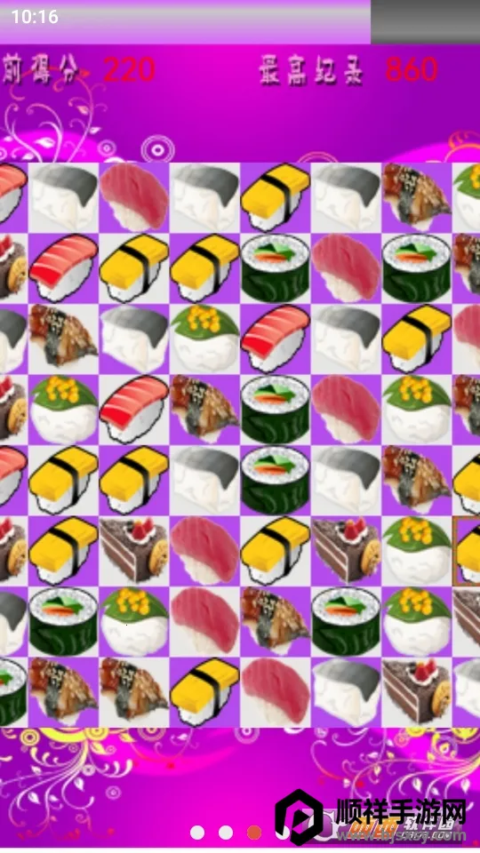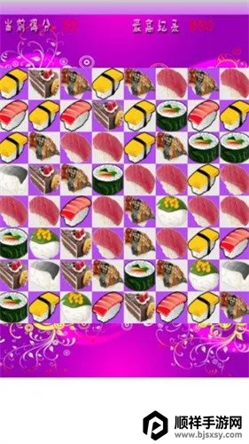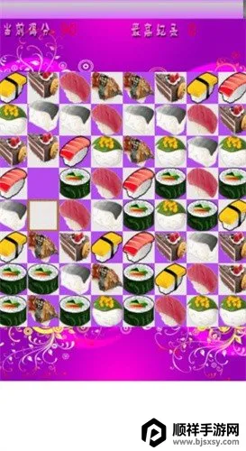 2. 寿司图案缤纷多彩,交换位置相连一线即可消除得分,享受指尖盛宴。