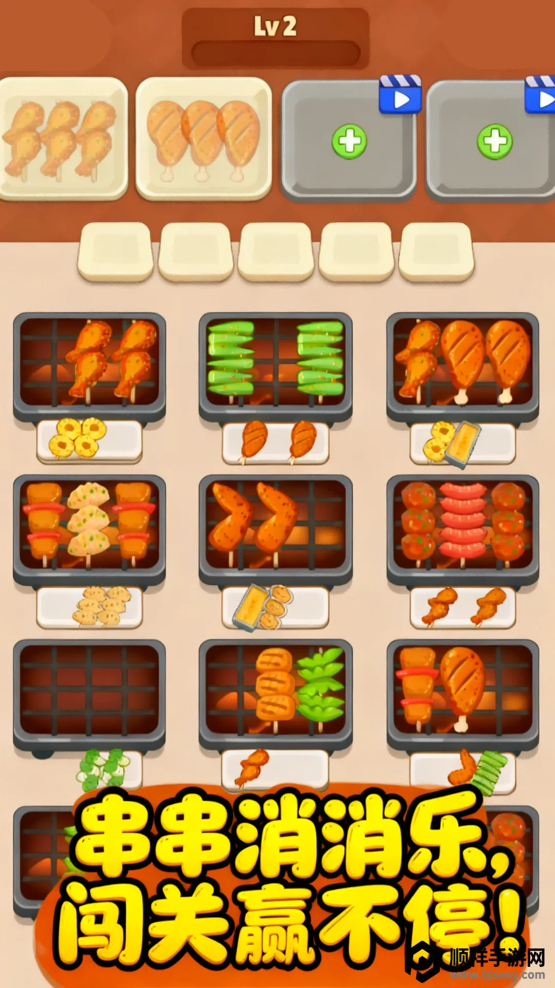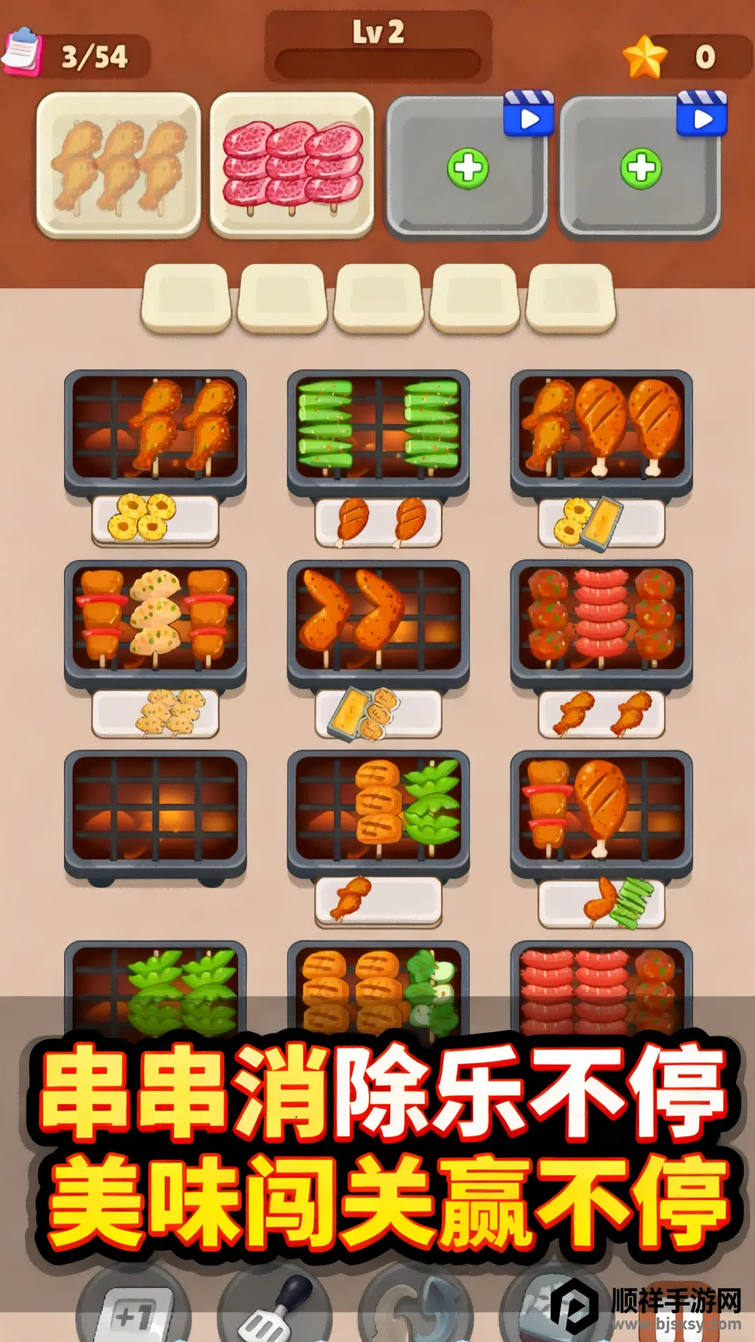 4. 多样玩法:玩法简单,点击移动烧烤完成消除,还能选择不同难度挑战,创新烧烤主题可解锁更多特色美食,提供道具助力,还有魔性背景音乐和精彩特效增加趣味。