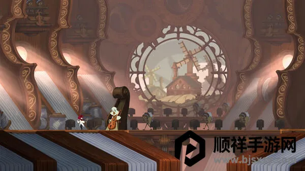 游戏玩法丰富多样。你操控飞乐梦的小提琴和琴弓,既能演奏天籁之音,又能穿越障碍应对挑战。飞乐梦能在复杂地形弹射翻飞攀爬,感受紧张刺激的平台跳跃。随着冒险推进,重启沉睡机械,恢复王国生机与能量,揭开世界秘密。