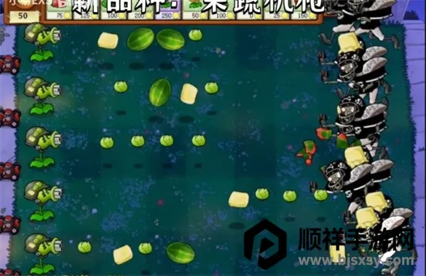 3、过关得到窝瓜,一次性使用的植物,可以消灭同行两侧的单个或复数个僵尸。