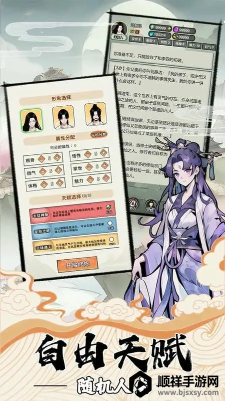 1、自由定制独特人生:可自定义角色外貌、性格与背景,开局天赋属性自由选择,能触发各式各样的修仙人生,无论是勤勉修行成为潇洒自由仙,还是快意恩仇戏红尘,皆由自己决定。