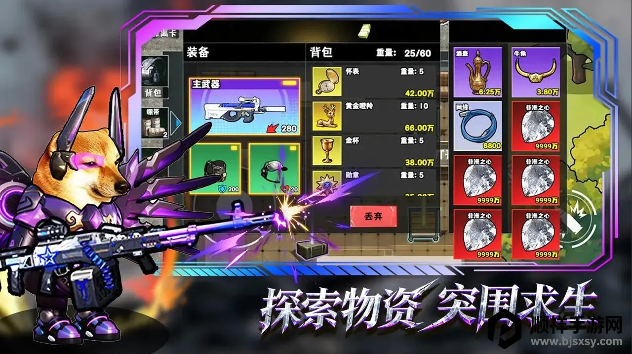 修勾逃生巨人危机内置菜单最新版本超好玩!它是一款以小狗视角展开的3D潜行冒险手游。内置菜单超实用,能设置人物不受伤、子弹无限,还可直接解锁全部地图,免广告获奖励。游戏玩法独特,你扮演修勾在巨人危机四伏的实验基地找生机,场景从废弃实验室到地下管道,利用环境解谜。最新版本更新超给力,非洲之星等爆率提高,皮肤全解锁,多数角色血量无限,商店防具部分免费,药剂仅收1块钱。免广告得奖励,干员免费升级且技能CD为0,点击干员催更还能获1兆金币。挖矿小游戏里,高级武器兑换最后一个武器免费,伤害高达1兆且适用所有地图。快来体验这款充满趣味与挑战的游戏,开启独特的修勾逃生之旅吧!
